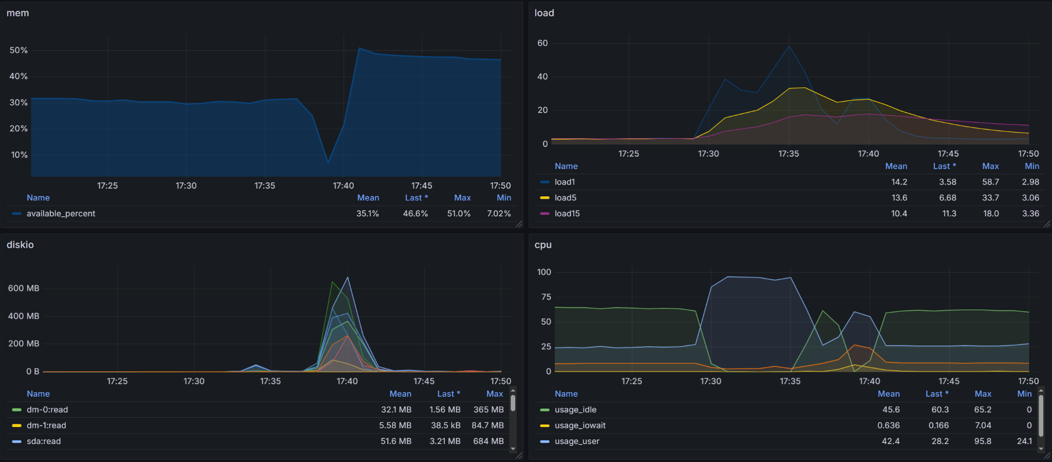 load1 지표가 17:35쯤 58.7까지 급등 (정상보다 수십 배 높음)